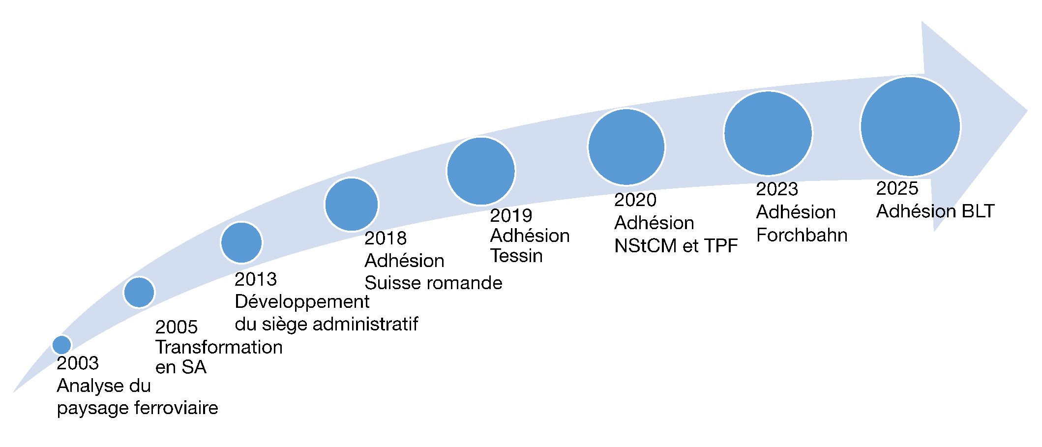 En 2003, afin de renforcer leur collaboration et de jouer un rôle actif dans le domaine des transports publics, plusieurs compagnies ferroviaires décident de fonder RAILplus en tant qu’entreprise individuelle. En 2005, l’entreprise, composée de sept actionnaires (AB, ASM, BDWM, FART, MGB, RhB et WSB), devient une société anonyme. En 2006, quatre chemins de fer rejoignent RAILplus (zb, RBS, BOB et MOB). Sept compagnies romandes puis deux sociétés tessinoises (FART - Centovalli et FLP) deviennent, quant à elles, membres de RAILplus respectivement en janvier 2008 et en mai 2019.